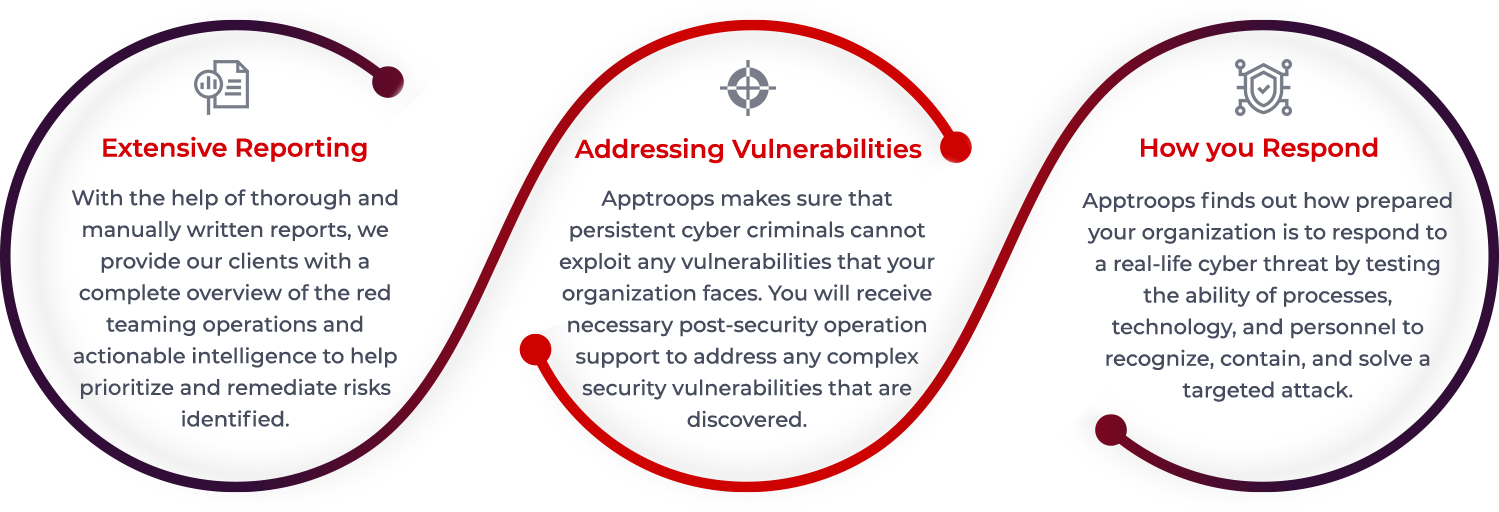 Apptroops approaches every Red Team test in a different way for each organization. Our methodology is performed by the industry’s top security testing technique, based on thousands of worldwide engagements and customized for individual requirements. Each Red Team test uses special techniques and intelligence from the Apptroops’s Counter Threat Unit that is designed as blended attacks that combine various techniques to avoid detection and helps prevention. Apptroops’s approach allows clients to improve the detection of attacks as well as defenses against miscreants, and to tune their existing devices to detect advanced methods.